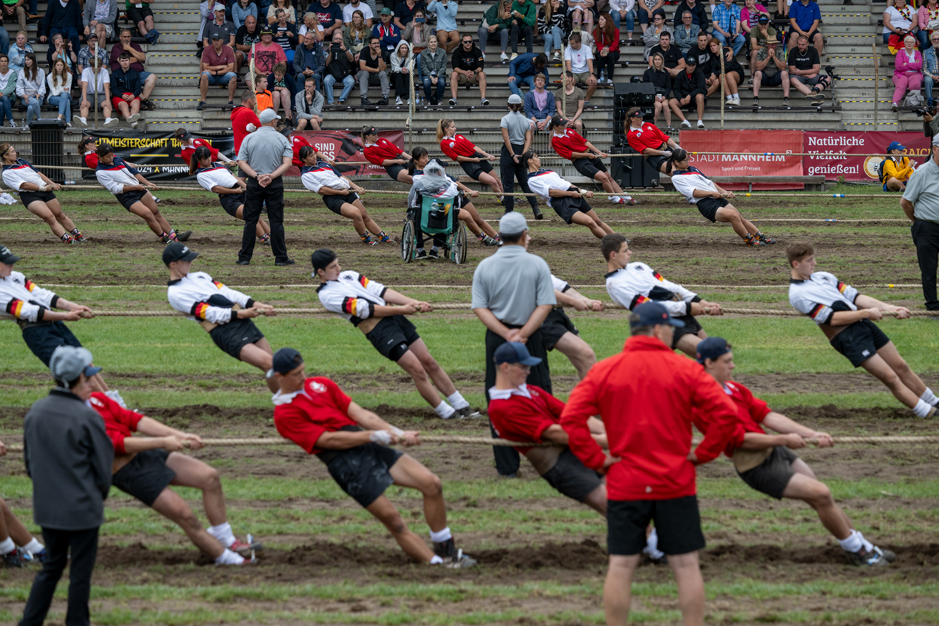 Seilzieh WM vom 5. bis 8. September 2024 in Mannheim, Deutschland. Ich war vier Tage als Fotograf an der Seilzieh WM in Mannheim im Einsatz. Vier intensive und lange Wettkampftage bei Nebel, Regen und Hitze. Als Belohnung gab es zwei Gold-, zwei Silber- und eine Bronzemedaille und die damit verbundene Qualifikation für die World Games 2025 in Chengdu, China.